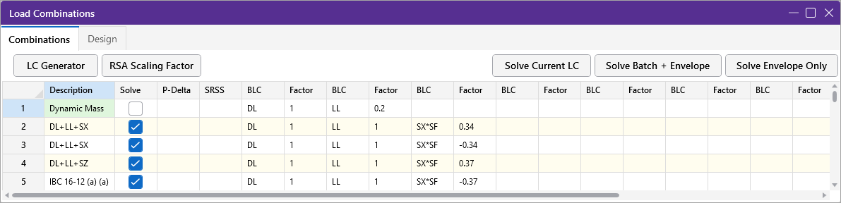 The Apply SF to all RSA Load Combinations checkbox applies to the SF scale factors for all load combinations that currently reference response spectra results. The final Load combinations will appear similar to those shown below: