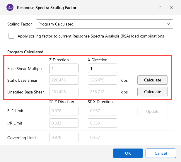 The Base Shears section of the Spectra Scaling Factor window box reports to you the static base shear and the un-scaled RSA base shear for each direction. If these values have not been calculated yet, then you may press the Calculate button. This launches the Seismic Load Generation window for the calculation of the Static Base Shear, or the Dynamic Solution dialog for the calculation of the Unscaled Base Shear for your Response Spectra results.