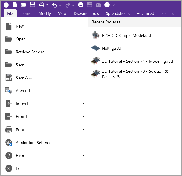 To the right of the File Menu are recently opened files with a preview of the model file. Selecting one of these files will close the current file, prompting for saving if necessary, and will open the selected file.