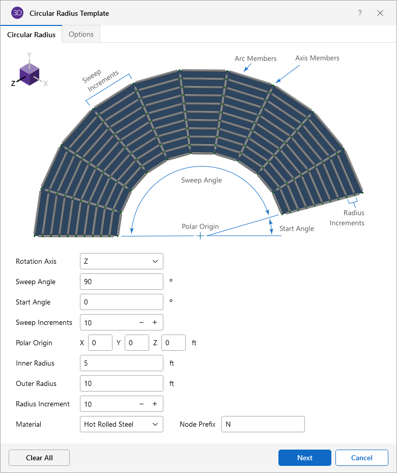 Section Set defines the section set assigned axis members or arch members. There are entries for a section set for both the arc members and the radius members so these two sets of members can be different sizes. To generate these members you must select a valid section set. If you don’t select a section set, you won't generate these members. You may also have unique labels assigned to the generated members by entering a start label. |