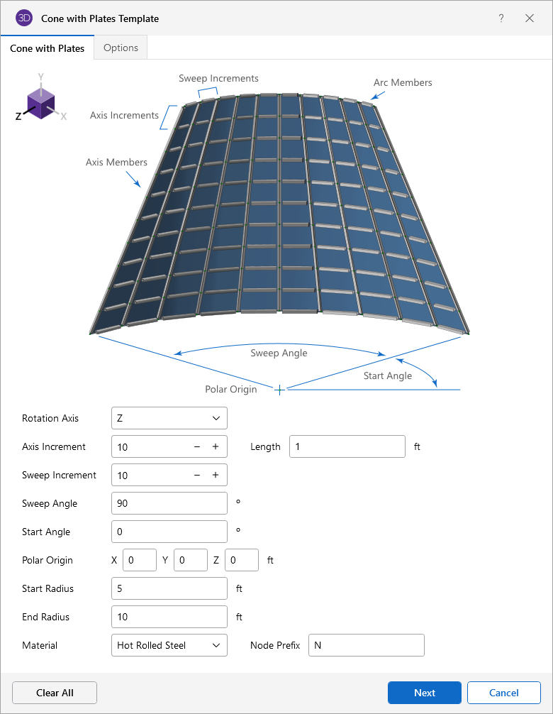 The Material option defines the material used to assign properties to the cone members. A Material Set for plates must be defined. |