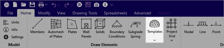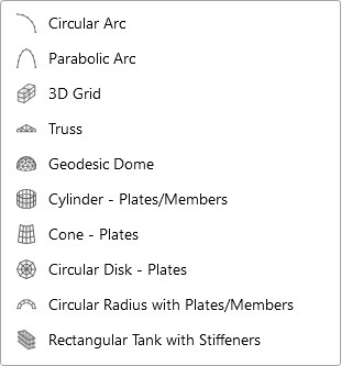 Access the Generation types from the Home tab by clicking on the Templates button. You will see the following options, which require you to specify basic parameters to generate structures with beam elements, plates, or a combination of both.