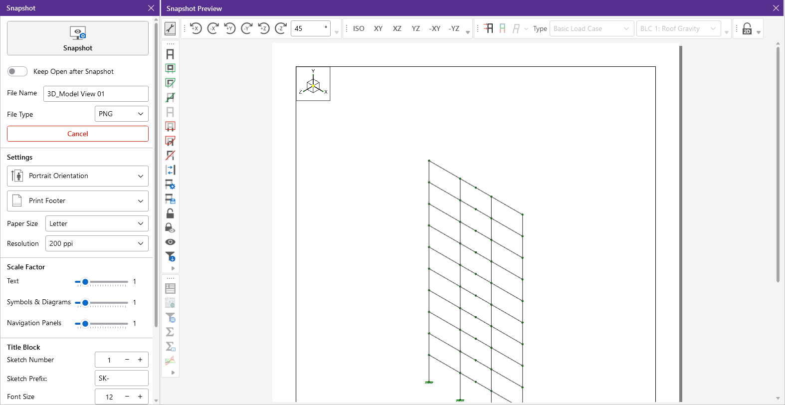RISA-3D includes an ‘Image Capture’ tool on the View ribbon that allows you to create a custom snapshot by capturing a snap shot of a model and saving it. If you have a view that you like to work with or have created a view that took some time to set up, save it with this feature. All of the Model View Settings are saved with the model for later recall.