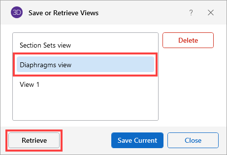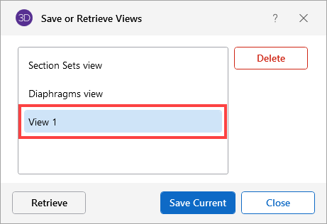 The view is saved and the Name Saved View window is closed. You are returned to the Save or Retrieve Views window where you can see the view you just saved, along with all other saved views.