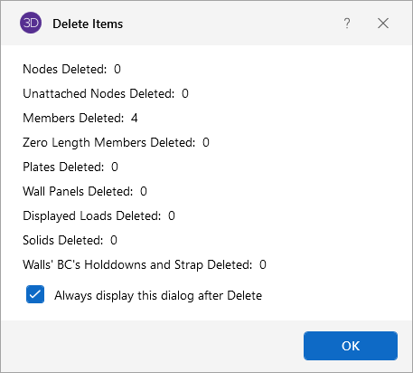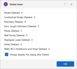 If you wish to delete based on the current selection state, you must use the check boxes to define the criteria the program will use to perform the deletion. Only items that are selected and that have their check boxes "checked" will be deleted. The choices let you delete nodes, members, plates, wall panels, solids and/or loads.