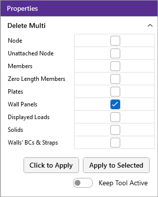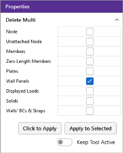 2. (Optional) Click on the Keep Tool Active slider if you want the ‘Delete Multi’ list to remain open in the Properties panel, so that you can delete additional part types or parts.