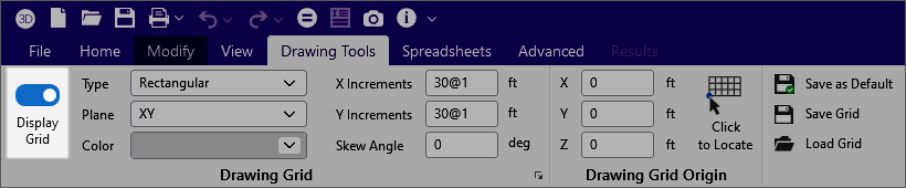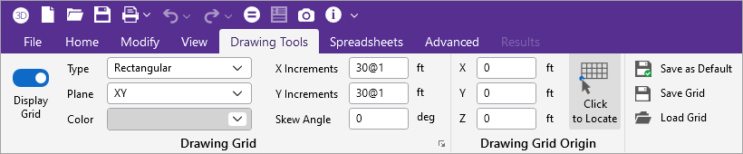 In the Drawing Grid and Drawing Grid Origin sections of the ‘Drawing Tools’ ribbon, enter the information that you want to save.
