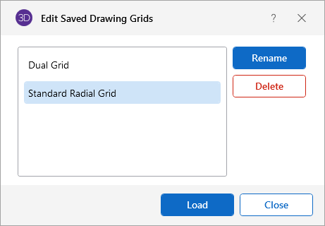 The ‘Load Grid’ feature lets you recall a saved drawing grid. See Recall a Drawing Grid for more information. |