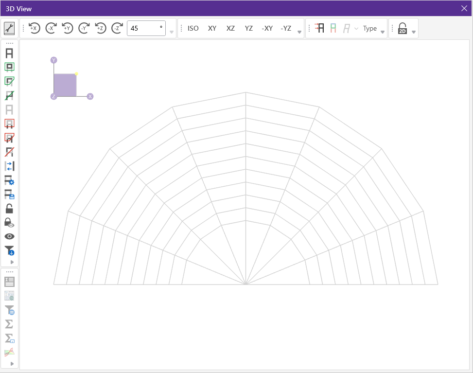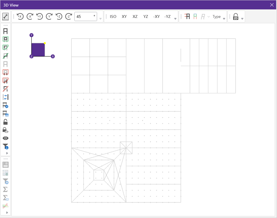 The rectangular drawing grid can be skewed by specifying a skew angle. This option is available in the Drawing Grid Section section of the Drawing toolsribbon. This skew angle allows for the creation of a regular rectangular drawing grid, but displayed in the model view at the specified angle, inclined from the global axis.