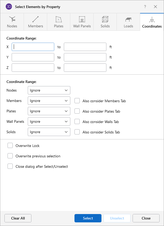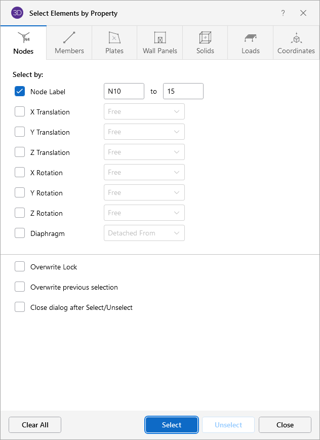 Note: If the Also Consider ... Tab checkbox is checked, all criteria will be applied together so that the affected items will meet all of the criteria. For example if you specify a range of node labels and coordinates, only the nodes within the coordinate bounds and within the label range will be selected/unselected.