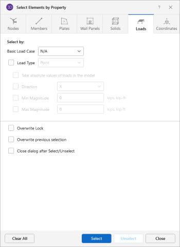 Note: If no criteria are specified, all the loads will be selected/unselected.