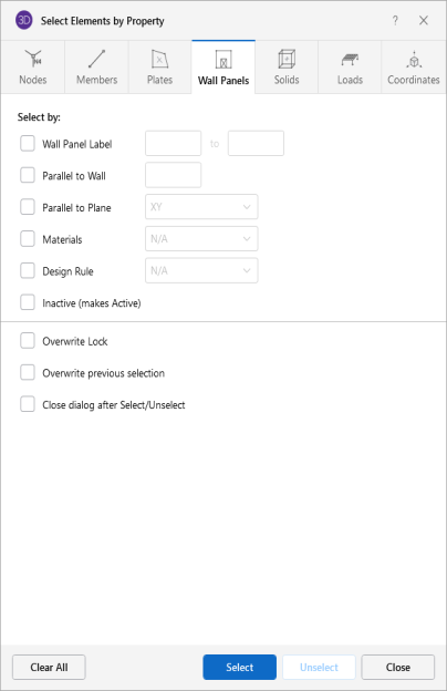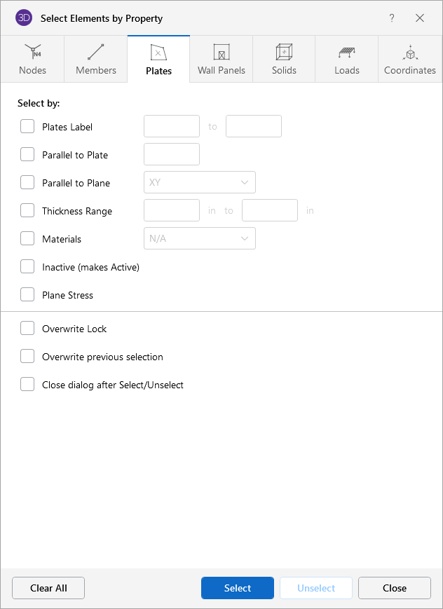 Overwrite Lock – When checked, it applies the specified criteria to be selected or unselected regardless of any part of the model being locked.