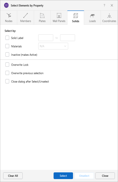 Material Properties – Select or unselect solid elements base on their material. You also may select solids that are currently inactive. Using this criterion will make these solids active. To make them inactive once again you can then use ModifySolids.