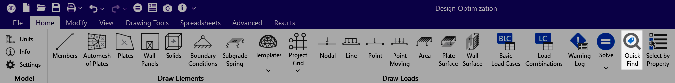 You can quickly find elements in a model using the Quick Find tool located on the Home ribbon toolbar.