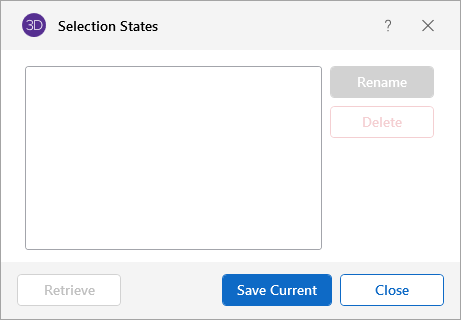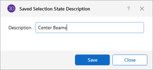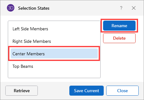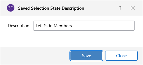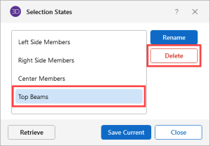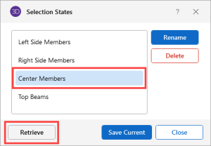 You can save and recall various selection states for a model. If the model is altered after a selection state has been saved, the saved selection state will also be altered. Any new items (joints, members…) will be set to "selected" in any selection states saved prior to the creation of the new item.