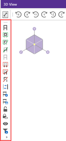 Some of the tools are for one-time applications such as Select All. Other tools, such as Box Select, place you in a selection mode that remains active until you cancel it. The current mode is indicated by the mouse pointer and by the state of the button. While in a selection mode the button stays depressed until you click it again, choose another button, or press the ESC key. You can have more than one model view open and be in different modes in each view.