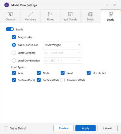 Check Magnitudesto display the numerical magnitude of the loads. You can specify that the loads be drawn as Basic Load Cases, Load Categories or Load Combinations by selecting the corresponding radio button. The load types to be displayed can be selected by checking the corresponding boxes.