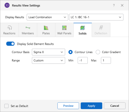 If a single or batch solution has been performed, you can display contour lines representing the force or stress results for the solids. Each color line represents a specific value. For batch solutions, you must choose which load combination you want to view at the top of the Results View Settings dialog.