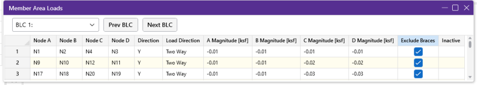The Exclude Braces column allows you to include or exclude certain members in the area load attribution, including Vbraces, Hbraces, Tension-only, Compression-only, and Euler Buckling members.