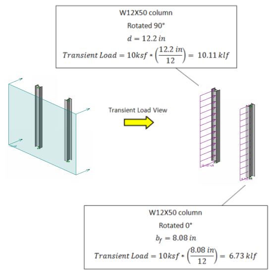 This, however, will not work if the area load is not applied at the top of the wall, or there is no diaphragm defined where the area load intersects the wall panel. In this case no load will be applied to the wall. All of the load will go in the opposite direction.