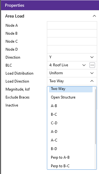 The area loads are defined by polygons of three or four sides. The area loads can be uniform or tapered. They may be assigned a direction for one-way span situations, considered as two-way membranes that transfer load in all directions, or be assigned with an "Open Structure" load distribution which will apply loads to members based solely on their projected surface area. The loads from the area are assigned to the nearest members, not to plates.