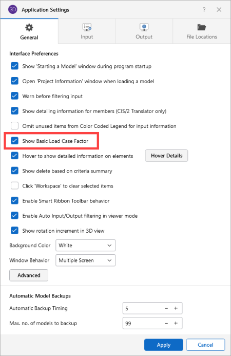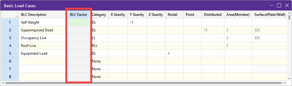 You can apply a scaling factor to an entire Basic Load Case in the Basic Load Case spreadsheet. These scaling factors give the user the flexibility and freedom to modify and manipulate the loading conditions in the model.
