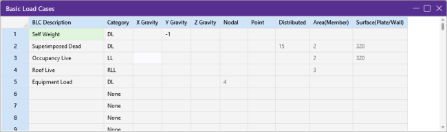 The basic load cases may be assigned to load categories, such as dead load and live load, which are commonly used in building codes. You can do this on the Basic Load Cases spreadsheet. These categories may then be combined to define load combinations used in analysis.