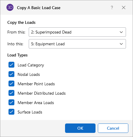 To do this, open the Basic Load Case spreadsheet and right click on the load case that you wish to copy and select Copy Basic Load Case from the drop-down list. The Copy A Basic Load Case dialogue will open and allows you to specify the load case that you want to copy the loads into, as well as the types of loads that you want to copy. For example, if you check Nodal Loads and uncheck all the other load types, only the nodal loads will be copied.
