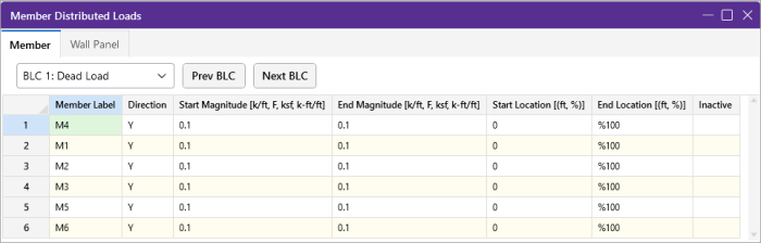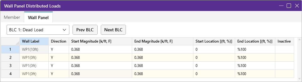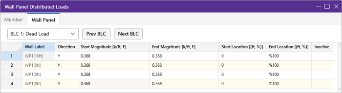 The Wall Panel Distributed Loads Spreadsheet records the distributed loads on your wall panels. Note that the loads are specific to the BLCs and that you can use the drop-down list to choose a different one. The columns in the spreadsheet are the same as the member distributed load spreadsheet.