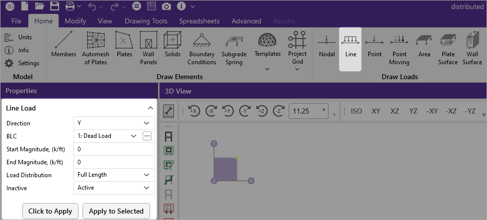 2. Click the Draw Line Load  icon and define the load in the Property Panel
