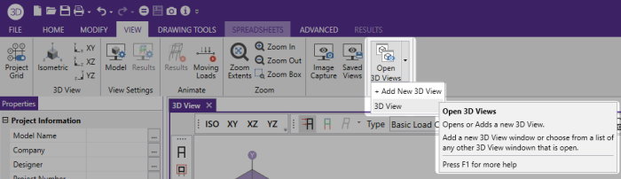 1. If there is not a model view already open, choose the Add 3D View option from the Open 3D Views drop-down on the Viewribbon