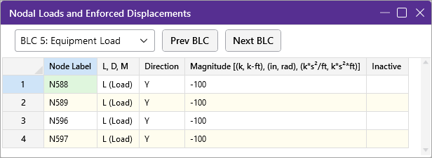 The last column allows you to set the specified load as an "Active" load that will be considered for the analysis, or an "Inactive" load that will not be included in the analysis.