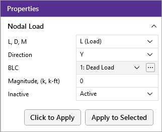 You can apply nodal loads to nodes. You must enter the load direction, magnitude and type. Make sure that you are careful to enter the correct BLC number that you want the loads assigned to. See Nodal Load/Displacement above for more information on nodal loads.