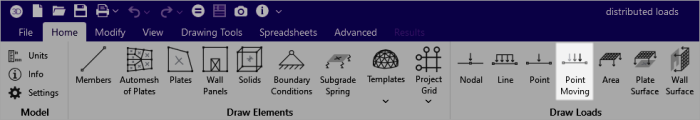 However there are times when you can want to investigate the full model design (all member results, detail reports, deflected shape, etc.) at a specific step. You can easily create a static load case of the moving loads at a specific load step using the Point Loads from a Moving Load feature. You can access this feature by clicking the Point Moving icon in the ‘Home’ ribbon.