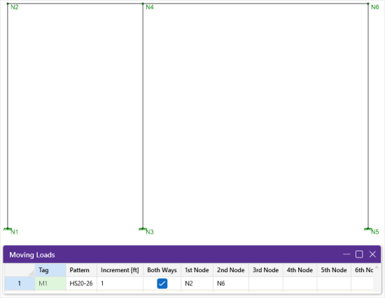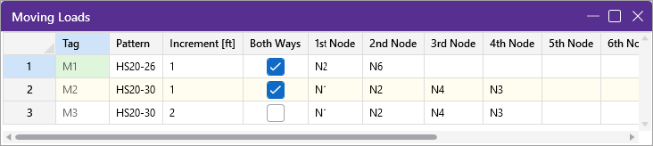 Each moving load definition is automatically assigned a Tag on the left side of the spreadsheet. These labels may not be edited. Moving loads are included in your analysis by referencing this label on the Load Combinations spreadsheet.
