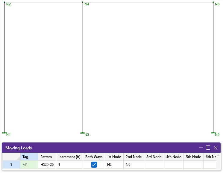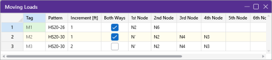 The Both Ways column is a check box that indicates whether the moving load pattern is to be applied in both directions of the load path or just one way along the load path. If the box is checked the load is first run from the start node all the way to the last node of the load path. The load is then turned around and the last node is now treated as the first node in the load path. The load is then run back to the first node in the load path.