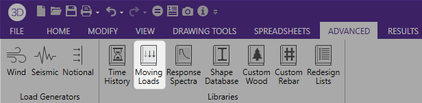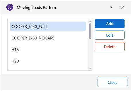 You can access the Moving Load Patterns and add or edit your own patterns by clicking on the Moving Loads icon on the ‘Advanced’ ribbon and then clicking on Add or Edit.