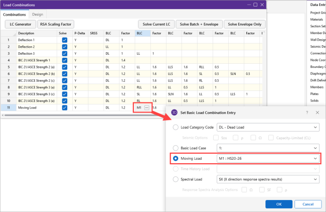 1. Specify the moving load in the Load Combinations spreadsheet in one of the BLC columns, and enter a corresponding BLC Factor.