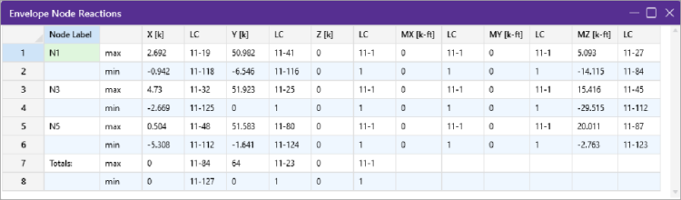 For these result spreadsheets, the maximum and minimum values are shown for each section location, for each active member. The governing load combination and step location is also shown for each result value under the "LC" column. The first number is the load combination, the second is the step number: (load combination - step number).