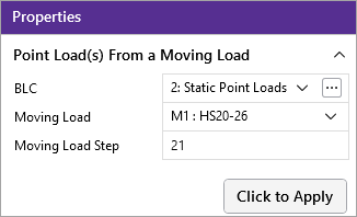 The Point Load(s) From a Moving Load data appears in the Properties panel.