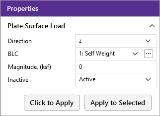 3. Define the load in the Plate Surface Properties Panel. Use the dropdown menu to select load Direction, and BLC.