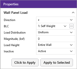• To apply the load to a selection, choose Apply to Selected. If nothing is selected, Apply to Selected will assume the full model is selected and apply changes to all wall panels.