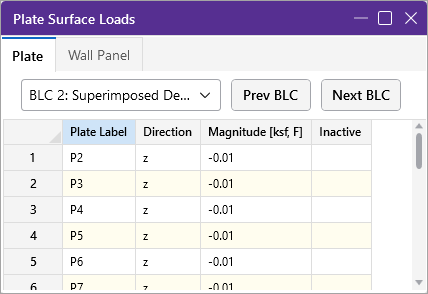 Under the Plate tab the first column contains the label of the plate to be loaded. The second column defines the direction of the load. Direction options are discussed in the next section. The third column holds the magnitude of the load.