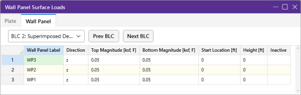 To apply surface loads to wall panels enter the load direction, start location (from bottom), height, and magnitudes (top and bottom). Make sure that you are careful to enter the correct BLC number that you want the loads assigned to. See Surface Loads above for more information on surface loads.