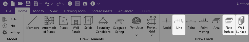 - Click the Line icon, Plate Surface Load icon, or Wall Surface Load icon in the ‘Draw Loads’ section.