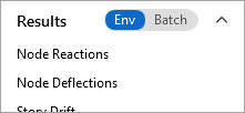 Note: If the solution run is a Batch with Envelope solution, then two sets of results spreadsheets are available in many cases, Envelope and Batch. The Env/Batch toggle in the Results toolbar will determine which spreadsheet opens. For example, with Env selected, pressing the Member Forces button will open the Envelope Member Forces spreadsheet. If Batch is selected, pressing Member Forces will open the Batch Member Forces spreadsheet.