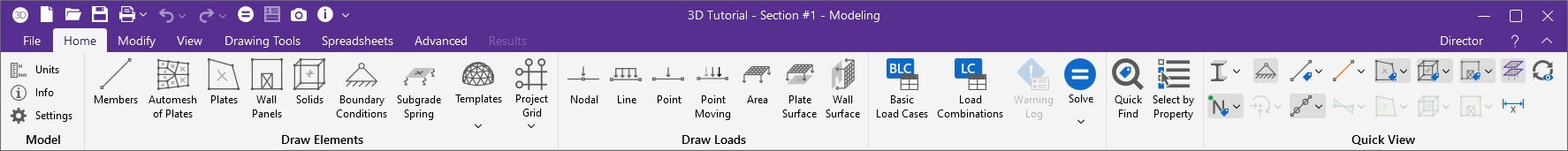 All of the program features may be accessed through the Ribbon toolbar system beginning with the File tab on the far left and ending with Results tab on the far right.