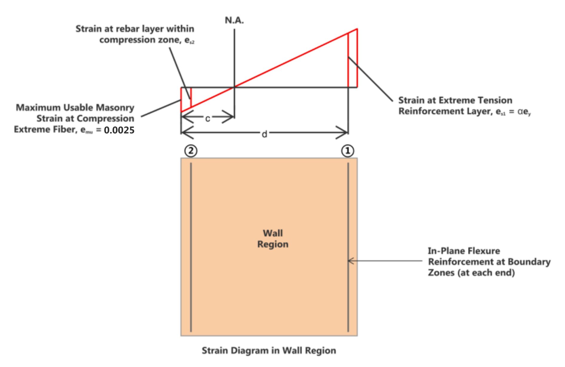 The maximum usable masonry strain at the extreme compression fiber, emu, is assumed to be 0.0025 for the calculation of the strain at the extreme tension steel for Seismic Detailing checks. For assumptions of the extreme compression fiber for non-seismic in-plane checks, refer to the In Plane Design - Strength section.