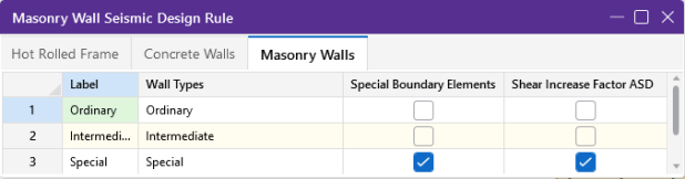 Ordinary: This wall type will perform design checks based on the minimum reinforcement requirements of Ordinary Reinforced Masonry Shear Walls per section 7.3.2.3.