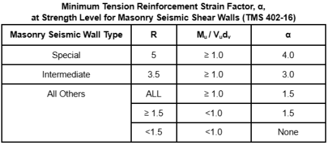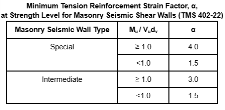 For walls not designed with Special Boundary Elements and designed using a Strength code, wall panel regions will be checked against maximum flexural reinforcement requirements per Section 9.3.3.2 for TMS 402-16 and 9.3.5.6.1 for TMS 402-22. These sections stipulate minimum levels of strain at the extreme tension fiber, which the program handles individually for each wall panel region, with a minimum tension reinforcement strain factor, “α”, for each masonry seismic wall type.